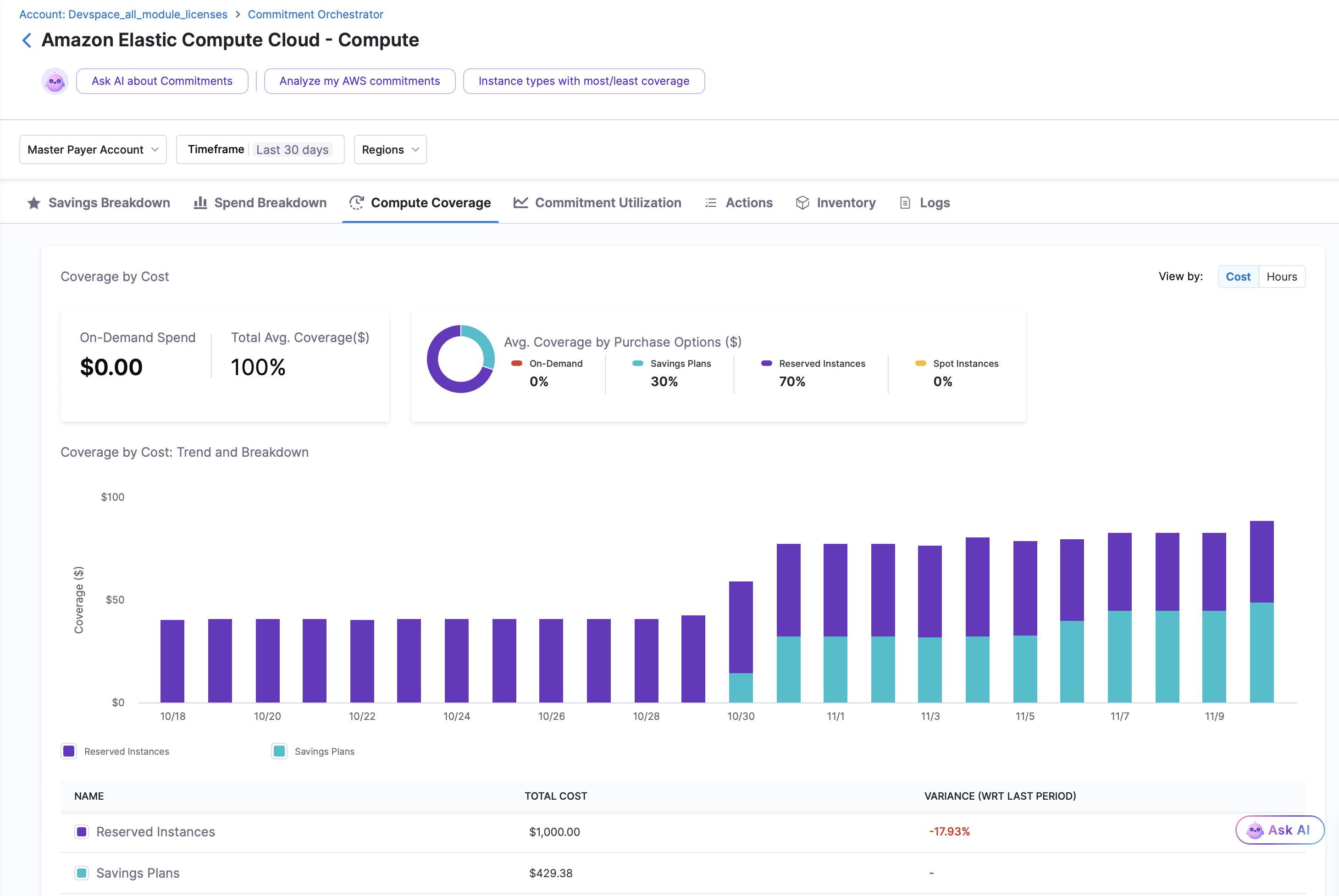 Compute Coverage: This represents the percentage of your EC2 compute usage covered by Reserved Instances or Savings Plans. It shows coverage by cost and displays how much you've spent on-demand as the total average coverage. It also shows average coverage by purchase options (On-Demand, Savings Plans, Reserved Instances, and Spot Instances) along with a graph for trend and breakdown. You can view compute coverage either by cost or by hours. When viewing by hours, it shows you the commitment hours and the coverage by purchase option in hours.