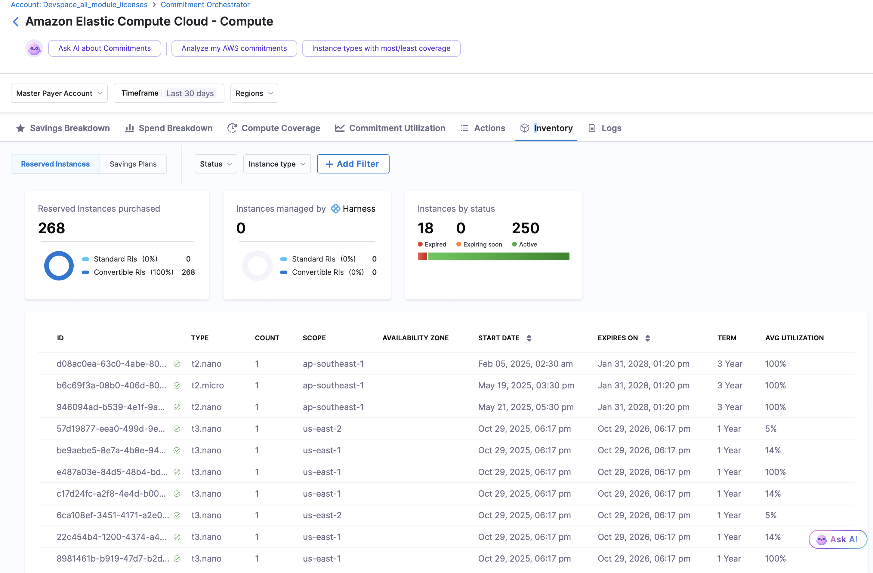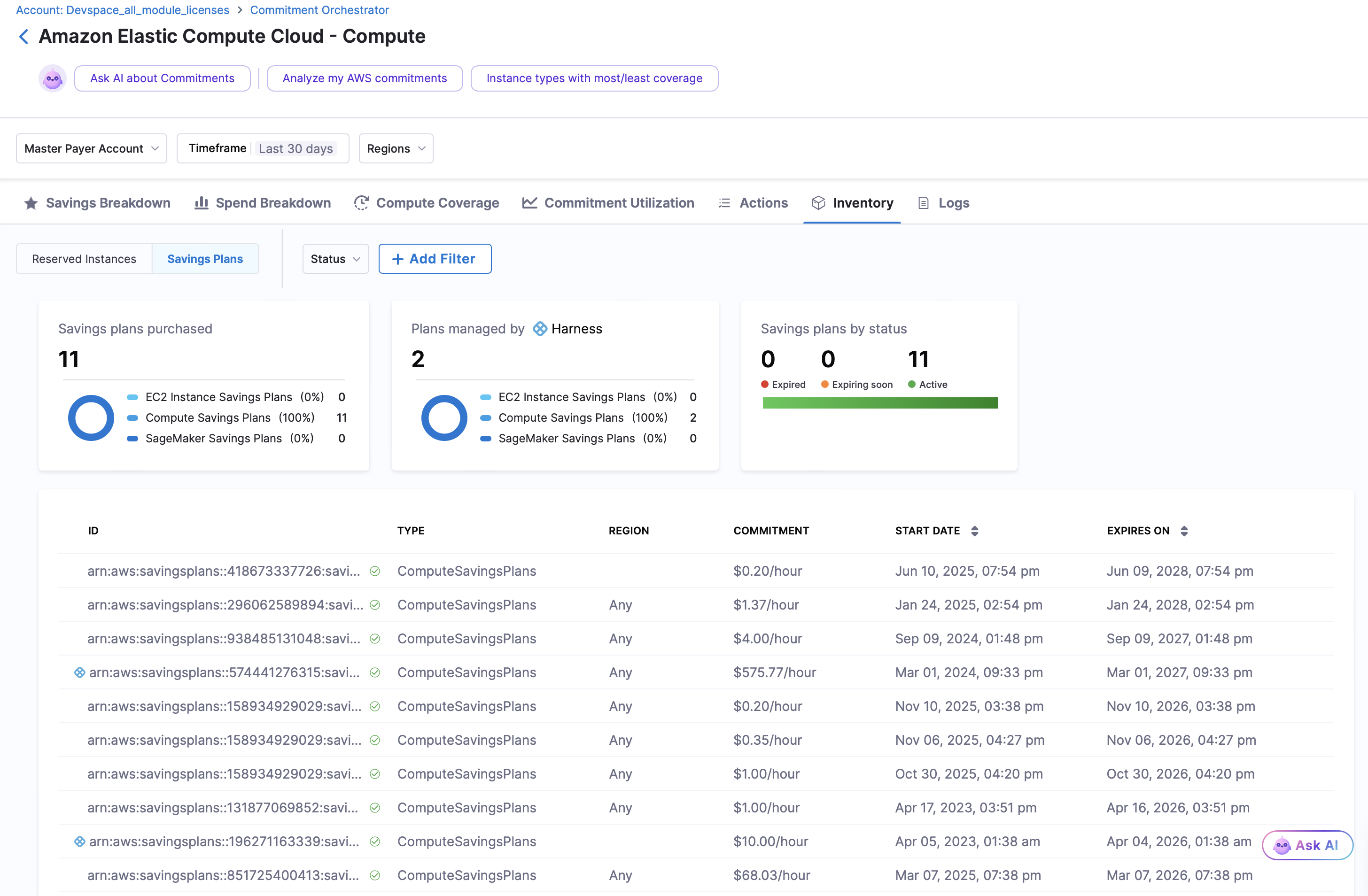 Inventory: With the new look of Commitment Orchestrator, Harness has introduced the inventory feature where you can see all purchases and managed instances along with their status (expired, expiring soon, or active). This unified inventory eliminates the need for separate AWS views or manual exports, giving you complete visibility directly inside Harness. You can select between Reserved Instances and Savings Plans to view their status and type.