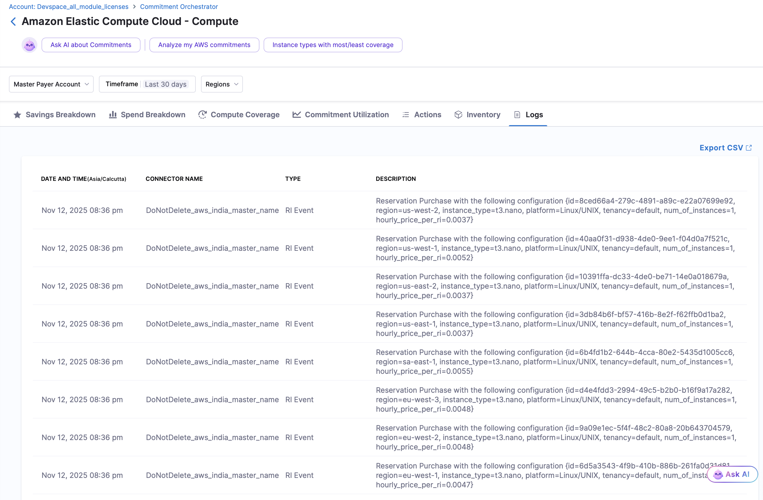 Logs: The Log History section provides a comprehensive audit trail of all Commitment Orchestrator activities, including date, connector name, type (RI Event and SP Event), and description of purchases. You also have the ability to export the logs as a CSV file.