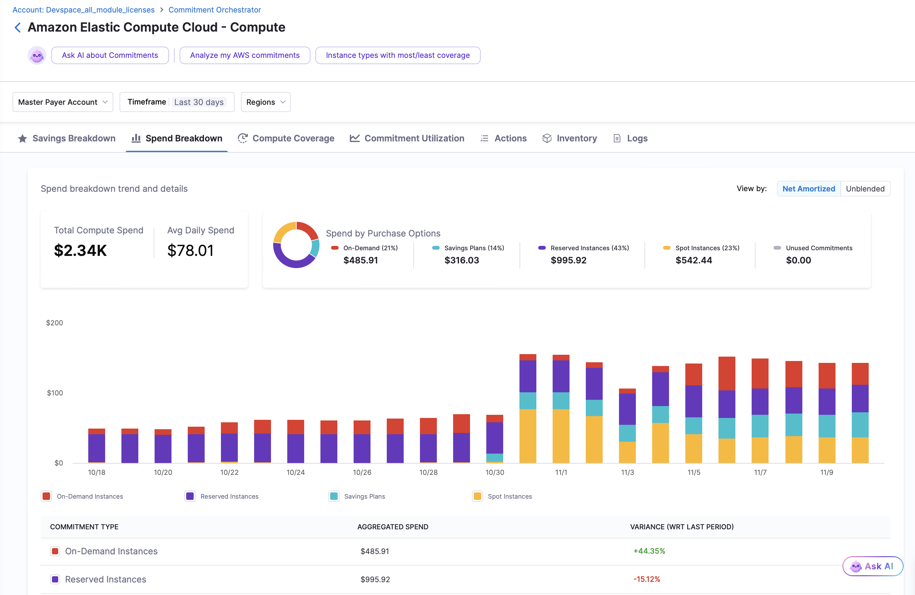 Spend Breakdown: This shows total compute spend and average daily spend along with spend by purchase options which can be On-Demand, Savings Plans, Reserved Instances, Spot Instances, and your new commitments. We also provide a graph showing your spend across different instance types along with the variance. Important: Both net amortized and unblended costs are now displayed, allowing you to view your spend in the format that best suits your needs.