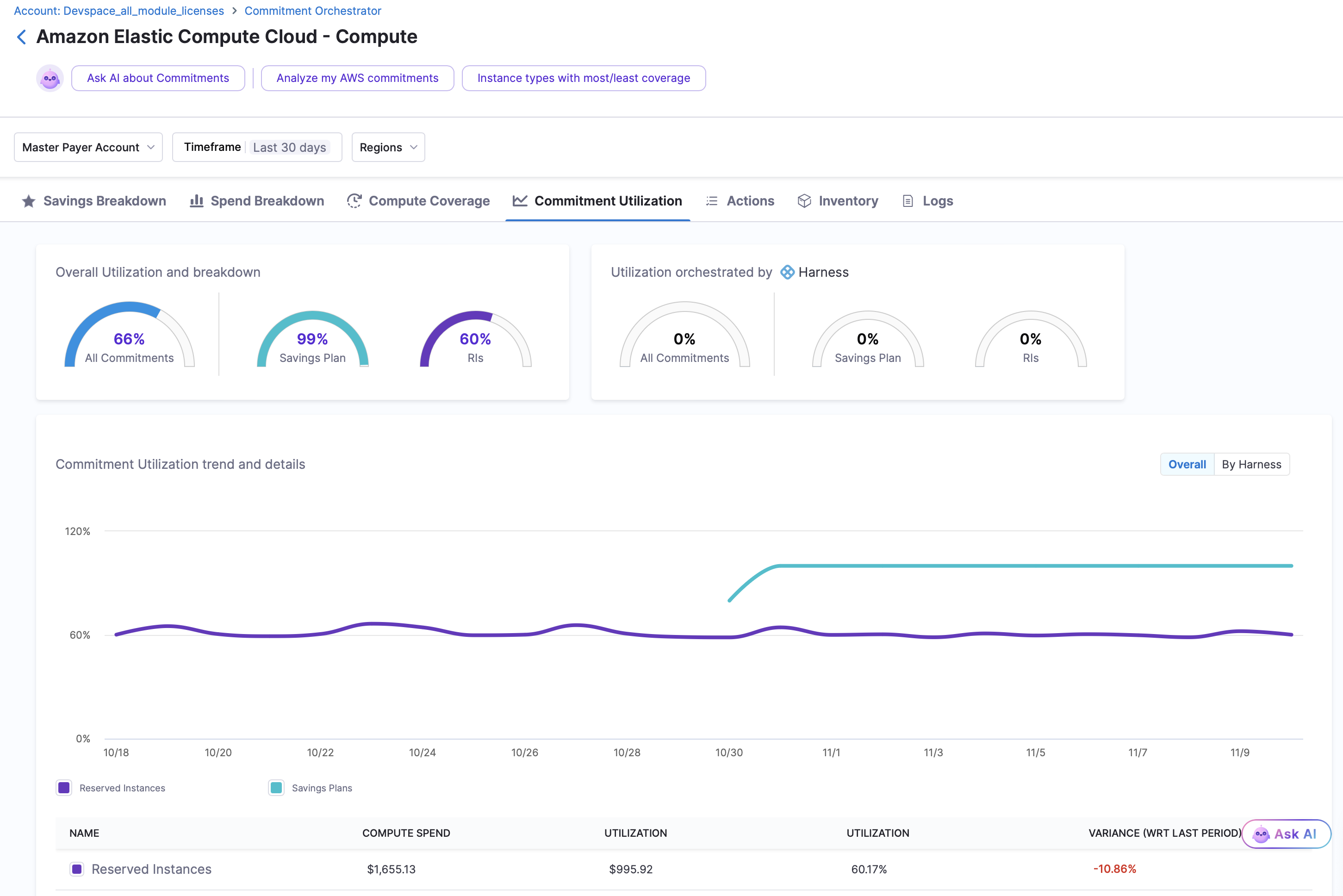 Commitment Utilization: This represents the percentage of your purchased Reserved Instances and Savings Plans that are actively being used. It shows the commitment utilization by purchase options. You can view utilization for all your commitments, including Savings Plans and Reserved Instances, as well as the utilization orchestrated by Harness. A graph displays the trend and details for compute utilization and variance over time.