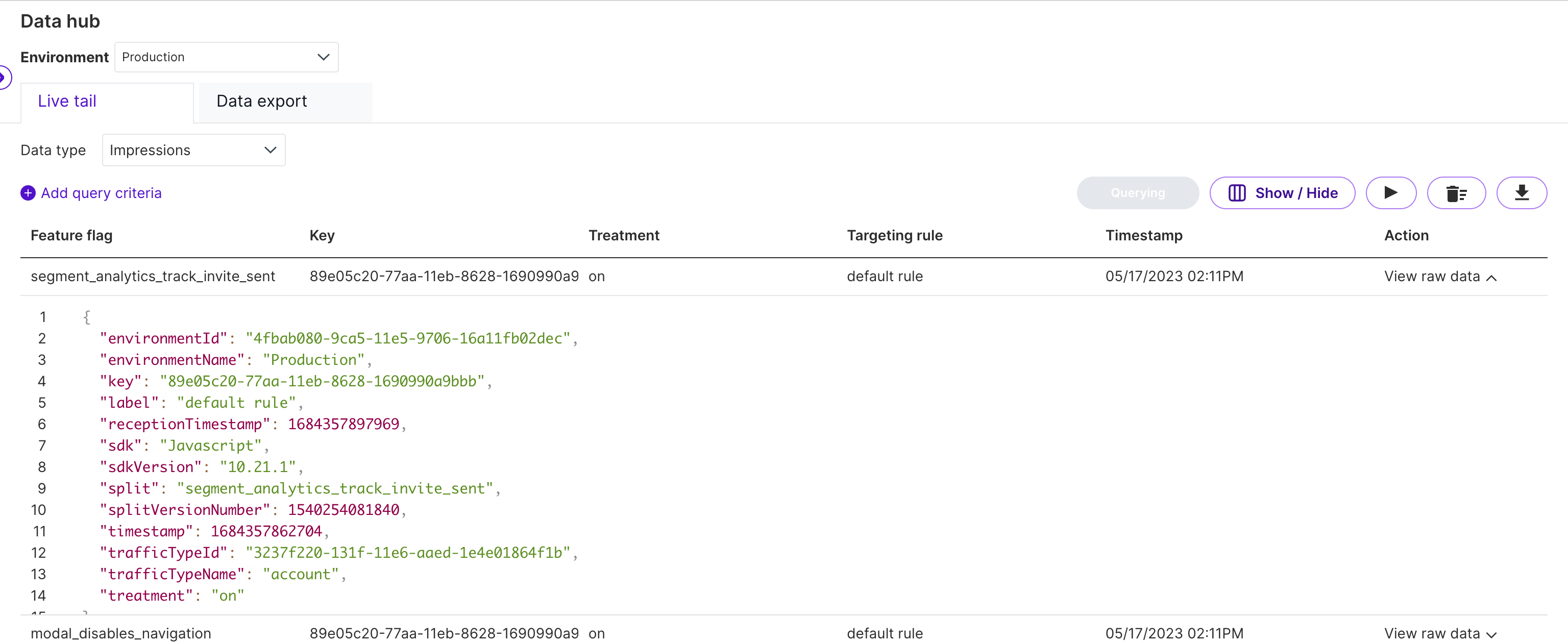 The Live tail functionality within Data hub gives development teams a single place to view and query all impression and event data. With Live tail, development teams can: