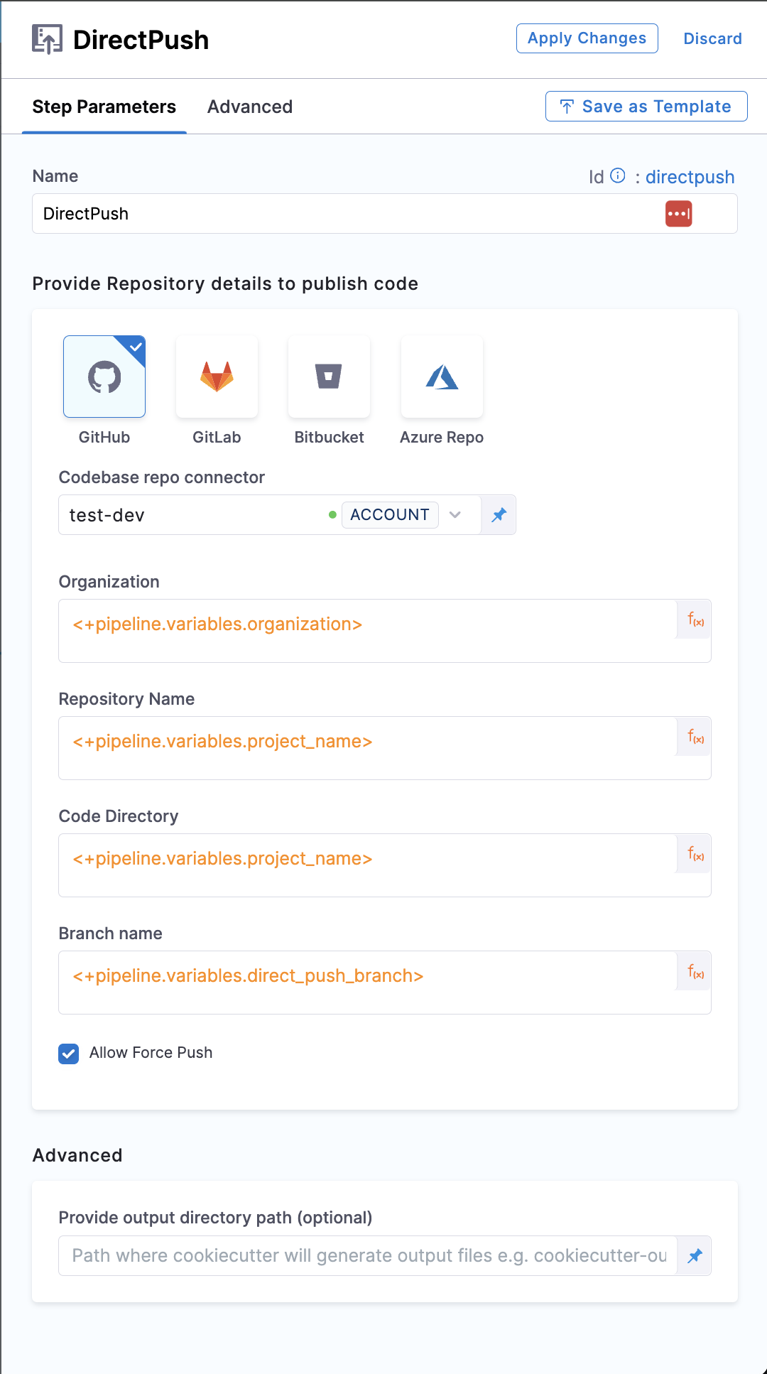 3. directPush: Used to push the service/application created using Cookiecutter step along with the catalog-info.yaml in the repo you created in previous step.
