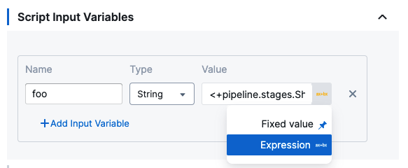 You can also use expressions in Value. For example, if you have an Output Variable from a previous Custom Approval or Shell Script step, you can copy it from the executed step Outputs.