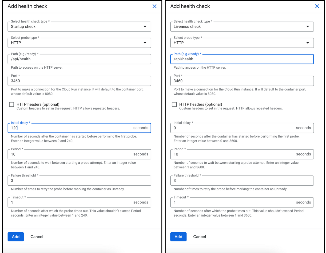 4. Click Add Health Checks, then configure the Startup Probe and Liveness Probe as follows: