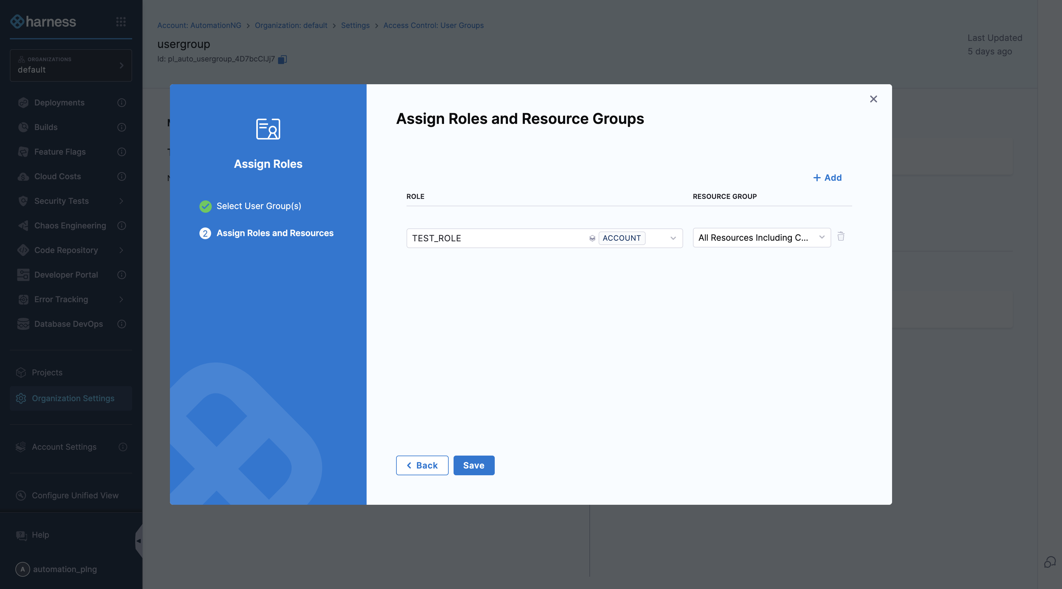 1. In Harness, go to Account Settings, select Organizations, select the relevant organization, and then select Access Control.