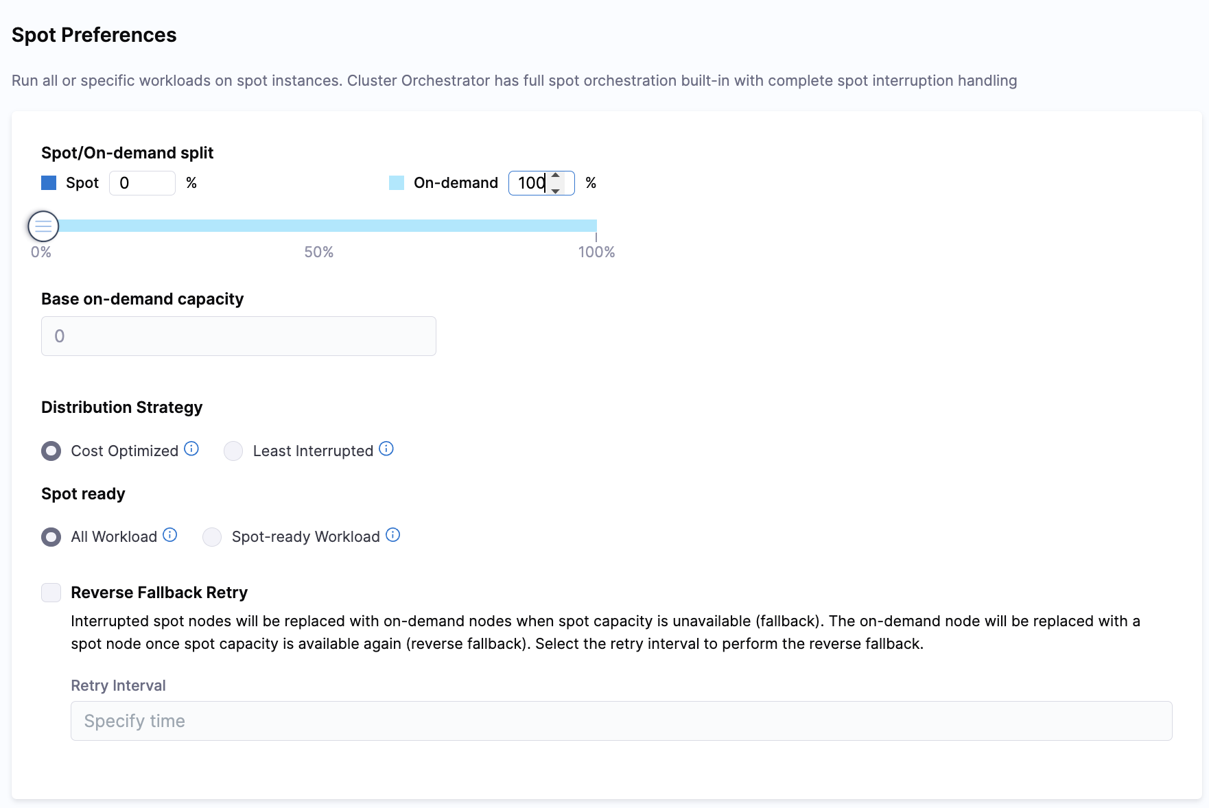 • Cluster Orchestrator Setup Flow Improvement: We have made a minor improvement to the setup flow of the Cluster Orchestrator. After selecting Cluster Preferences, the workflow will now proceed to Spot Preferences, followed by Replacement Schedules, and finally to the Finish stage. This adjustment is intended to prevent any oversight in configuring essential settings during the setup process. [CCM-25325]