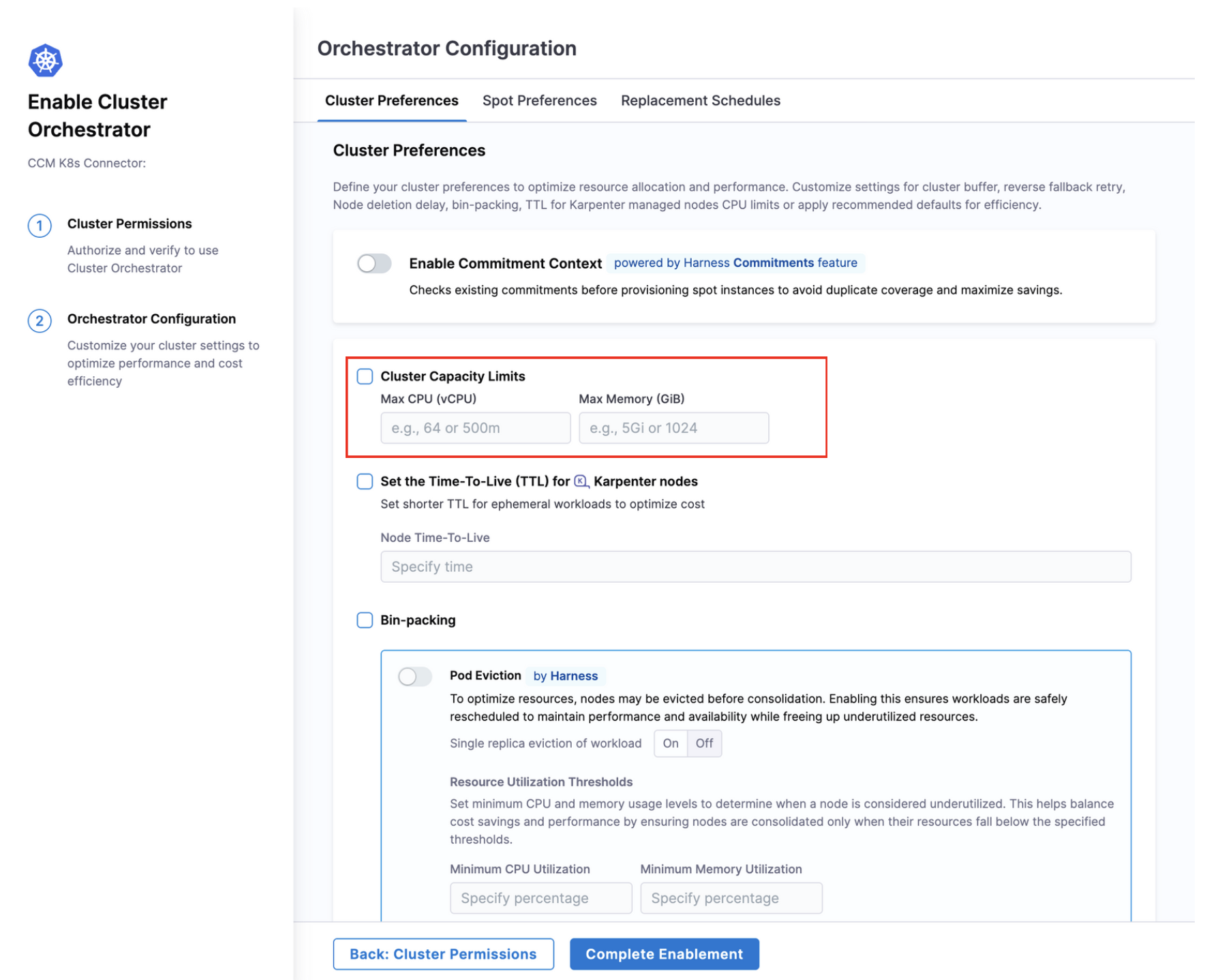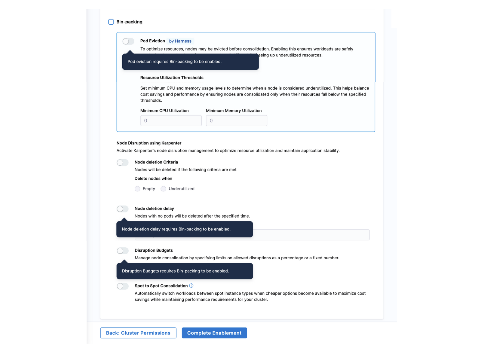 • Bin Packing Notification Enhancement: If Bin Packing is disabled for a cluster within the Cluster Orchestrator, a notification banner and confirmation dialogue will appear upon saving, indicating that “Bin Packing must be enabled for cluster scale-down and optimal node utilisation.” [CCM-25324]