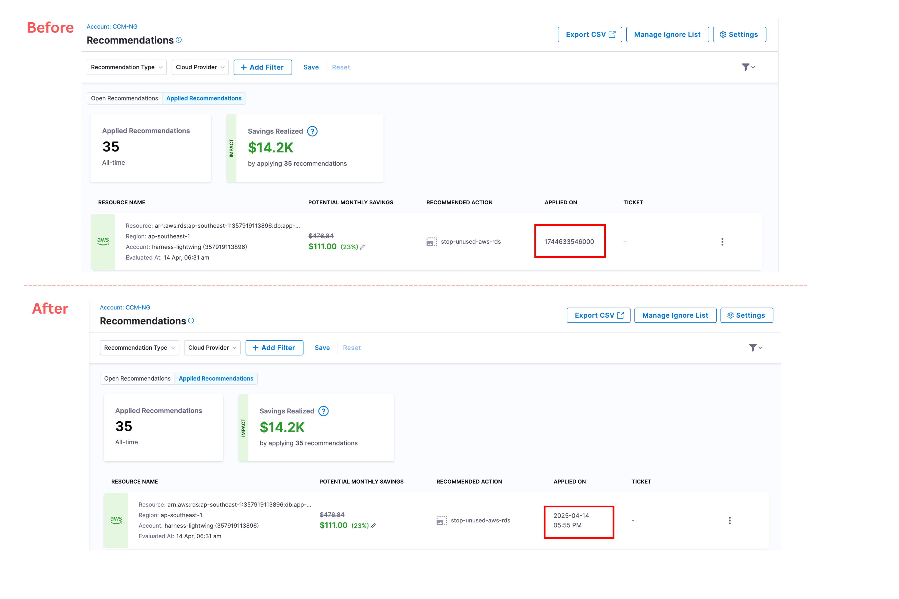 • Applied At: Date and time when the recommendation was applied (only for applied recommendations)