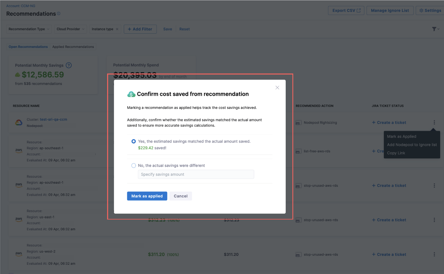 2. Default Project Mapping: Route recommendations to the right teams by mapping cost categories to specific Jira projects. When creating tickets, projects are auto-selected based on the resource's cost category, ensuring recommendations reach the appropriate stakeholders without manual routing.